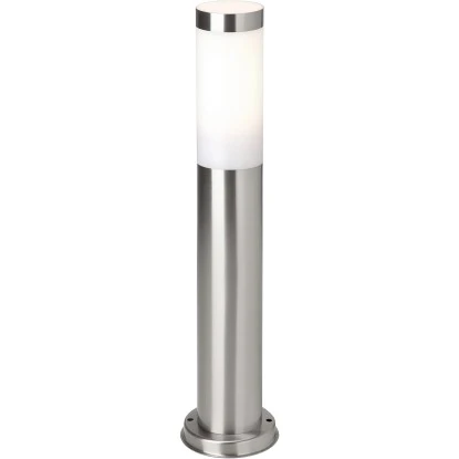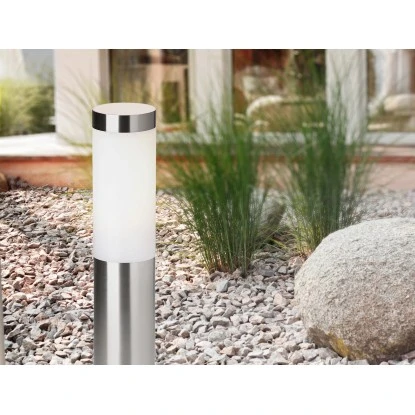 Die Sockelleuchte Kinna besticht durch klare Linien und hochwertige Verarbeitung. Die Leuchte aus rostfreiem Edelstahl ist mit einer weißen Kunststoffabdeckung versehen. Zudem ist sie gegen kleine Fremdkörper und Spritzwasser aus allen Richtungen geschützt (IP 44). Die Leuchte ist mit einer E27 Fassung für eine Leistungsaufnahme von maximal 20 Watt ausgelegt und kann sowohl mit Energiesparlampen als auch mit LED-Leuchtmitteln betrieben werden.