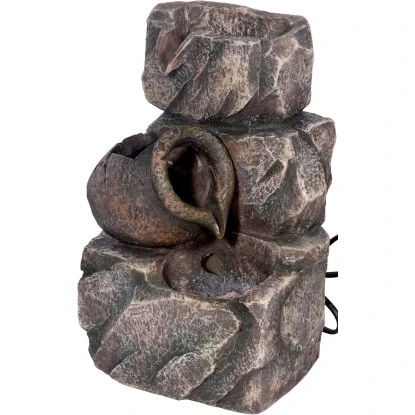 Das beeindruckende Wasserspiel verfügt über einen geschlossenen Wasserkreislauf mit einer geräuscharmen Wasser-Pumpe. Der Zimmerbrunnen wird mit einem Netzstecker betrieben inkl. 1,5 m Kabel. Er besteht aus Polyresin, ein moderner Hightech-Kunststein. Dies hat den Vorteil, dass der Brunnen aussieht wie ein echter Steinbrunnen, er aber viel leichter und vor allem stabiler ist.