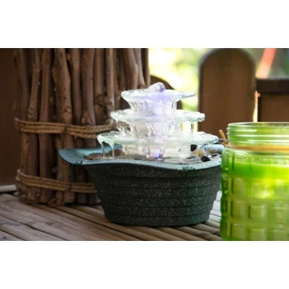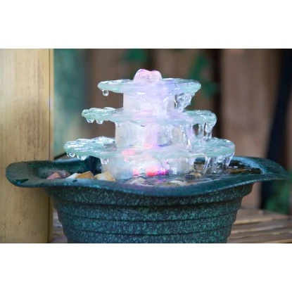 Der attraktive Dobar Zimmerbrunnen Kaskade bringt das entspannende Rauschen und Plätschern des Wassers direkt in Ihr zu Hause und in Ihr Büro. Der Brunnen besteht aus leichtem und robustem Kunststoff mit grünem Metallic-Look. Das Wasser fließt über drei transparente Glasstufen hinab. Die Abdeckung der Kunststoff-Unterschale kann mit den mitgelieferten Kieselsteinen ausgelegt werden. So erzeugen Sie ein entspannendes Wohlfühlambiente, das Sie den Stress im Alltag vergessen lässt.