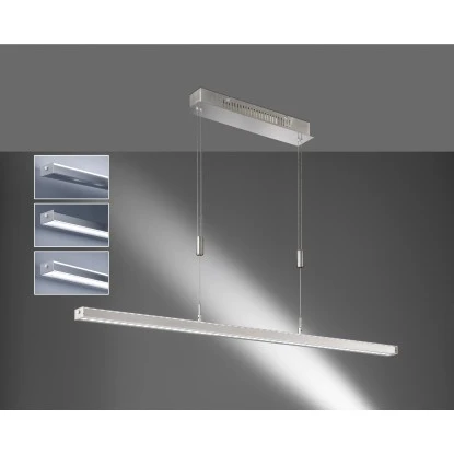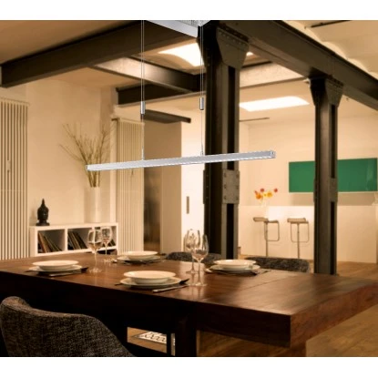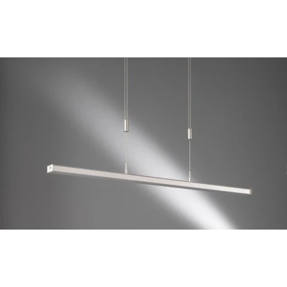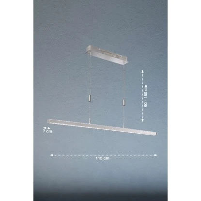 Durch die moderne Oberfläche in nickelfarben matt findet dieses Modell automatisch einen besonderen Platz in jedem Wohn- Essbereich. Mit einer Länge von 150 cm und einer Breite von 7 cm leuchtet sie jeden Tisch optimal aus und lässt durch die Höhenverstellbarkeit von 90-150 cm auch in diesem Bereich keine Wünsche offen.
