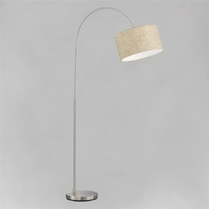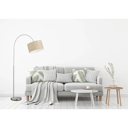 Die überragend schöne Stehlampe Arc von Fischer & Honsel mit Fuß und Gestell in mattem, nickelfarbenem Ton, die sich einerseits sowohl als Leuchte in der Leseecke als auch im Wohnzimmer optisch fantastisch macht. Der Leuchtenschirm besteht aus sandfarbenem Stoff und erzeugt ein eigenes, unverwechselbares Lichtflair im Raum, das auch größere Zimmer mühelos mit sanfter Helligkeit ausleuchtet.