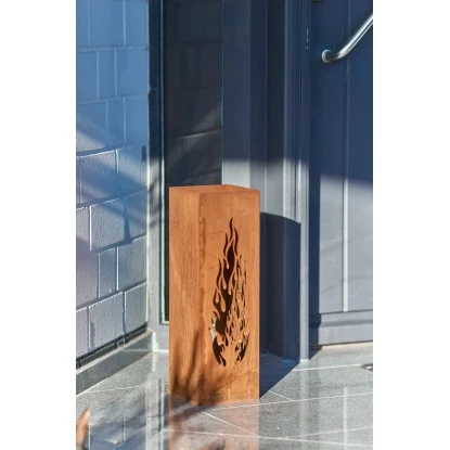 Vielseitiges Deko Highlight! Rund ums Jahr ein wunderbarer Blickfang für den Innen- und Außenbereich. Die Dekosäule in trendiger Edelrost-Optik ziert ein kunstvolles Flammen-Motiv. Bereits tagsüber ist die Dekosäule ein dekorativer Blickfang für Terrasse, Balkon oder Wohnzimmer – am Abend entfaltet sie ihre ganze Pracht. Durch eine LED Kerze (separat erhältlich) kann die Dekosäule erleuchtet werden. Das stimmungsvolle Licht strahlt durch das Flammendesign und verbreitet eine wundervolle Atmosphäre. Die kunstvolle Flammen-Ausstanzung befindet sich auf zwei Seiten. Bitte sorgen Sie für eine geeignete Unterlage, da es naturgemäß bei Edelrost zu Abfärbungen kommt.