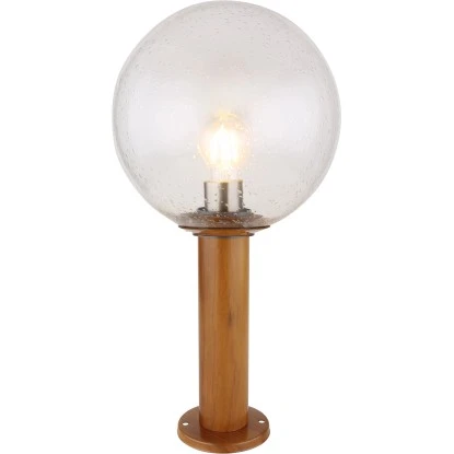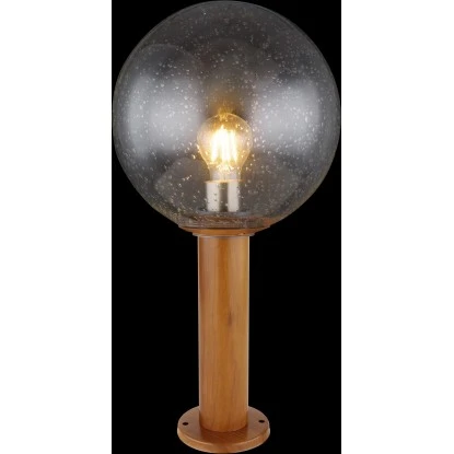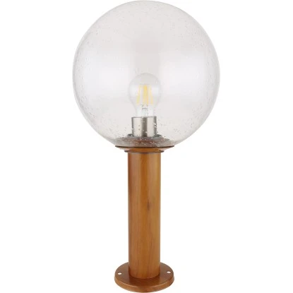 Diese zeitlose Außenleuchte (Ø25 cm) der Serie Ossy ist ideal mit einer Höhe von 50 cm als Stehleuchte im Außenbereich geeignet und macht durch ihre schöne Holzoptik ein tolles Gesamtbild. Aus einem zylinderförmigen Körper in schöner Holzoptik ragt eine E27 LED Fassung welche mit einem Leuchtmittel Ihrer Wahl, bis zu einer maximalen Leistung von 15 Watt, bestückt werden kann. Ein kugelförmiger Glasschirm mit Blasen überdeckt die E27 LED Fassung und sorgt für einen Schutz gegen Wasserspritzer.