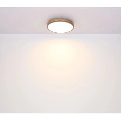 Diese runde Deckenleuchte begeistert durch ihr tolles Design. Der opalene Kunststoff, welcher die inkludierten LED-Leuchtmittel bedeckt, wird von einem runden Außengehäuse aus Metall und MDF in Holzoptik (Ø 30 cm) umschlossen. Mit den LED-Leuchtmitteln leistet diese ein angenehmes 3000 Kelvin warmweißes Licht.