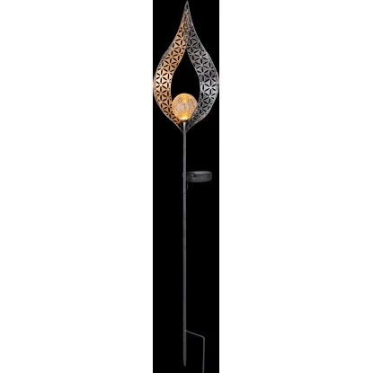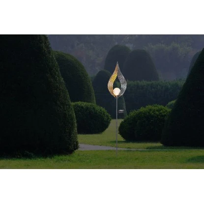 Mit dieser eindrucksvollen Globo LED-Solaraußenleuchte Glaskugel in Metallbogen Metall Silber (Höhe 90 cm) verbringen Sie bestimmt wunderschöne Stunden in Ihrem Garten. Diese Lampe ist nicht nur kunstvoll gestaltet sondern kreiert durch das gestanzte Metall (außen silberfarben, innen gelb), welches das runde Leuchtmittel in Crackle Optik umgibt, auch ein beeindruckendes Lichtspiel in Ihrem Außenbereich. Der Akku wird während des Tages über die Solarzelle aufgeladen und bringt dann in der Abenddämmerung das fest verbaute LED-Leuchtmittel voll aufgeladen ca. 8 Stunden zum leuchten. Die Solarlampe ist außerdem mit der Schutzart IP44 ausgestattet und daher spritzwassergeschützt. Setzen Sie das Gartenlicht ohne Bedenken in Ihrem Garten, Balkon oder Terrasse ein.