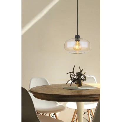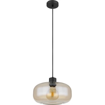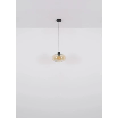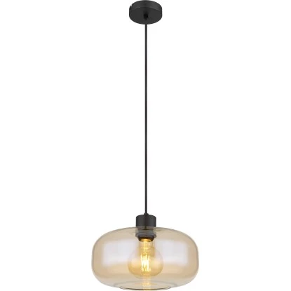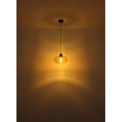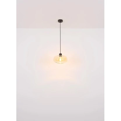 Diese schlichte Pendelleuchte überzeugt durch tolles Design. Aus einer runden Deckenbefestigung ragt ein 1,2m langen schwarzes Kabel und mündet an einer E27 Fassung welche von einem formschönen Glasschirm (Ø 28 cm) in Amber bedeckt wird. Die E27 Fassung ermöglicht Ihnen bis zu einer maximalen Leistung von 40 Watt, selbst über Lichtfarbe und Helligkeit zu bestimmen. Aufgrund von Stromersparnis und Langlebigkeit empfehlen wir LED-Leuchtmittel.