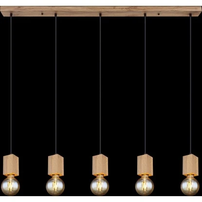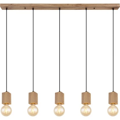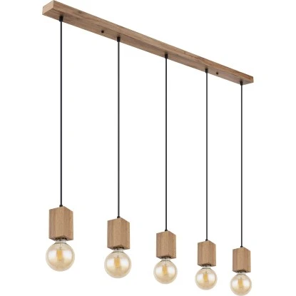 Diese zeitlose Deckenleuchte begeistert durch ihr schönes Design aus Holz. Die Leuchte besteht aus fünf E27 Fassungen welche jeweils aus einem Holzblock ragen und an fünf schwarzen Metallstangen 120 cm von der Decke hängen. Die E27 Fassungen ermöglichen Ihnen Leuchtmittel Ihrer Wahl, bis zu einer maximalen Leistung von 60 Watt, zu verwenden.