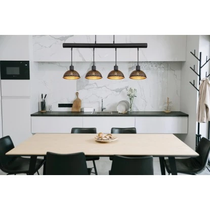 Diese wunderschöne Pendelleuchte der Serie Lenna begeistert durch ihr schönes Design. Diese besteht aus 4 Metallschirmen mit Musterstanzungen in den Farben Schwarz und Gold, welche an jeweils einer E27 Fassung mittels schwarzer Kabel zu einem Balken (91×19 cm) verlaufen und an zwei Kabeln bis zu 1,2m von der Decke hängen. Die E27 Fassungen ermöglichen Ihnen, bis zu einer maximalen Leistung von 40 Watt, selbst über Lichtfarbe und Helligkeit zu entscheiden. Durch weitere Modelle dieser Serie können Sie Ihren Wohnbereich perfekt ergänzen.