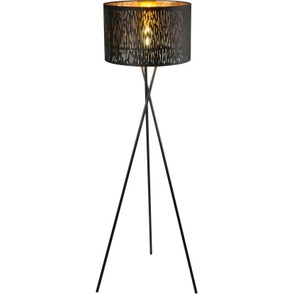 Super trendig und in eleganter Optik präsentiert sich die 160 cm hohe Stehleuchte Tuxon. Die Leuchte wird zu einem echten Blickfang, denn der Leuchtenschirm ist nicht nur mit einem schwarzen Samtstoff überzogen, sondern besitzt auch Dekorstanzungen, wodurch das Licht beeindruckend reflektiert wird. Im Inneren ist der 62 cm große Schirm goldfarben und gibt dadurch ein angenehm warmes Licht wieder. Ein zusätzliches Highlight der Stehleuchte ist das dreibeinige Stativgestell. Durch den ungewöhnlichen Leuchtfuß wirkt die Leuchte sehr modern. Egal wo man sie auch platzieren mag, alle Blicke werden auf die Leuchte fallen. Aufgrund einer E27-Fassung, haben Sie die freie Wahl des Leuchtmittels (max. 60 Watt). Außerdem verfügt die Stehleuchte über einen Schalter für das Ein- und Ausschalten.