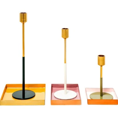 Saga ist ein wundervoller Kerzenständer für Stabkerzen. Er besteht aus drei stilvollen Kerzenständern, die in gruppierter Platzierung ein wunderschönes Gesamtbild ergeben. Die drei unterschiedlichen Höhen lassen sich hervorragend miteinander kombinieren und beliebig aufstellen. Die goldene, glänzende Oberfläche und die farbigen Standfüße verleihen Ihren Wohnräumen einen luxuriösen und gleichzeitig modernen Touch. Das dekorative Design lässt sich besonders durch schlichte Stabkerzen in dezenten Farben gut abrunden.