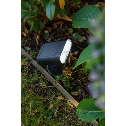 Die Lutec LED-Solar-Außenwandleuchte Ginbo mit integriertem Solarpanel ist optimal für ausgerichtetes Licht. Ginbo kann auch mit dem mitgelieferten Spieß in den Boden gesteckt werden.