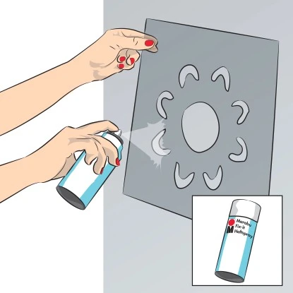 Der Malgrund muss sauber, fettfrei und trocken sein. Sprühen Sie die Schablone mit dem Marabu Schablonen-Haftspray aus einer Entfernung von ca. 30 cm ein. Achten Sie auf gleichmäßiges auftragen. Bei zu starker Nässe, durch zu viel Haftspray, sollten Sie die Schablone auslüften lassen oder abtupfen und erneut besprühen!