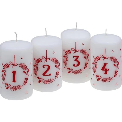 Die Steinhart Stumpenkerzen Waiting for Christmas 4 Stück 100 mm x 57 mm in Weiß sind gepresste und übertauchte Kerzen. Auf ihnen befindet sich aufgedruckte Motive, welche die Zahlen 1 bis 4 darstellen. Diese stehen für die letzten 4 Wochen vor Weihnachten.