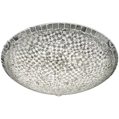 Die LED-Deckenleuchte aus der Serie Mosaique überzeugt durch ihr modernes Design und stellt ein besonderes Highlight an Ihrer Zimmerdecke dar. Der abgerundete Schirm aus silberfarbigem Mosaik-Glas sorgt für ein angenehmes Licht mit einer warmweißen Lichtfarbe. Das festverbaute LED-Leuchtmittel verfügt über 24 Watt und 2120 Lumen. Der Durchmesser der Leuchte beträgt 40 cm, wobei sie eine Höhe von 10 cm vorweisen kann. Die Leuchte ist mit einem Switch-Dimmer ausgestattet, mit welchem die Leuchte über einen normalen Lichtschalter in drei Helligkeitsstufen gedimmt werden kann. Die Leuchte ist sowohl umweltfreundlich, als auch stromsparend.