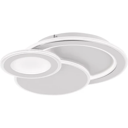 Die Wofi LED-Deckenleuchte 45,5 cm x 40 cm Weiß Dimmbar besteht aus drei unterscheidlich großen, verbundenen Ringen.